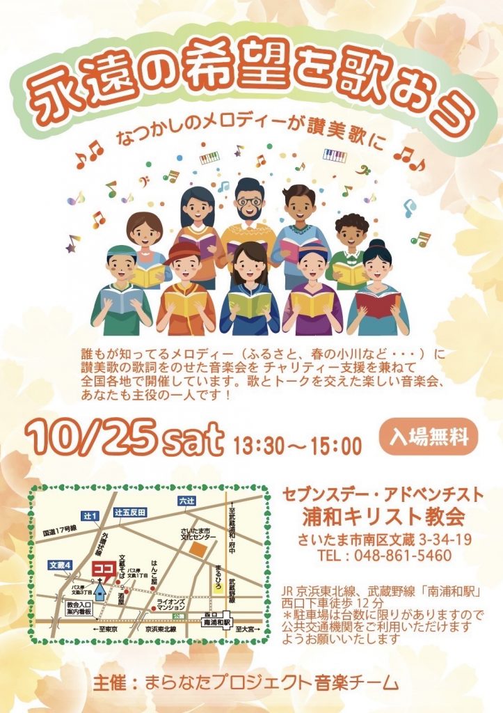 誰もが知っているメロディー(ふるさと、春の小川など)に讃美歌の歌詞をのせた音楽会を浦和教会で開催します。
